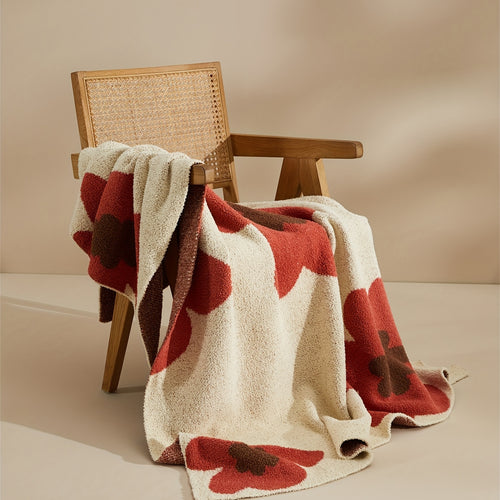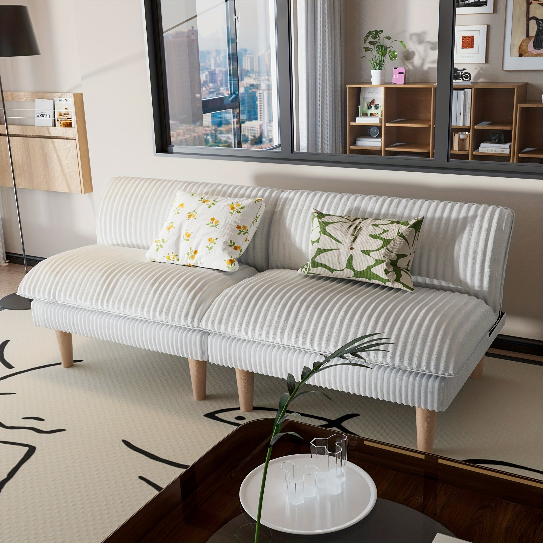 The single sofa delineates its own territory in the corner, the floor lamp cuts out a warm light area overhead, and the small blanket is piled up on the knees to create a soft shelter.